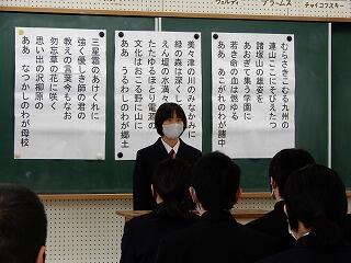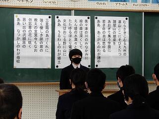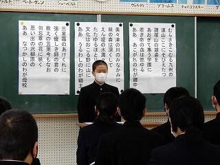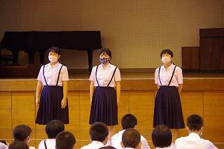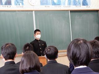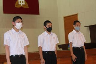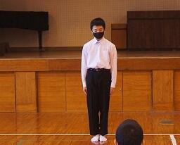 12月24日(木)は2学期の終業の日でした。終業式では、生徒代表として、1年生黒木賢斗さん、2年生若本康汰さん、3年生若本陸玖さんが2学期を振り返ってくれました。賢斗さんは、生徒会役員として、もっと「あいさつ」に力を入れるべきだった、また、学級は一致団結できた、3学期は「あいさつ」をよりよいものにしていきたい、と語ってくれました。康汰さんは、修学旅行など多くの行事が新型コロナウイルスの影響を受けたが、支えてくれた方々に感謝したい、3学期は野球部のキャプテンとしても、プレイヤーとしても成長したい、と語ってくれました。陸玖さんは、行事等で3年生が最高の取組ができたことを嬉しく思った、学習をもっとがんばるべきだった、3学期は入試に向けて、死ぬ気でがんばる、と語ってくれました。素直な反省と力強い決意を頼もしく感じました。