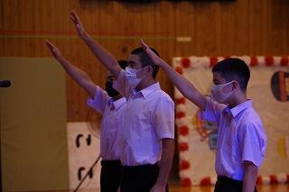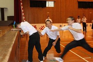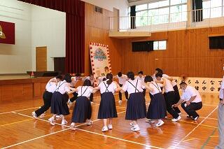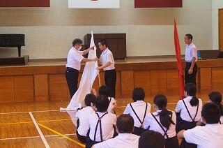 大清掃の後、結団式が行われました。保体委員長の3年生の翠嵯くんが式を取りまとめてくれました。実行委員、今年のスローガン、団長、副団長、団顧問、副団顧問、団職員等の発表がありました。団の色を決定するための儀式(全員参加型のアクティビティ)が行われ、白団赤団が決まりました。その後の団ごとのリーダーの紹介や応援の一部紹介など大変盛り上がりました。体育大会がとても楽しみです。