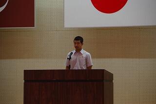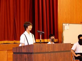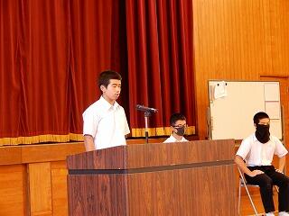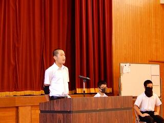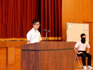 各部代表あいさつは、剣道部主将堀吉斗希也さんが「悔いの残らぬようしっかり準備して大会に臨みます。」、卓球部主将藤本昊さんが「まずは1勝を目指してがんばります。」と力強く語ってくれました。