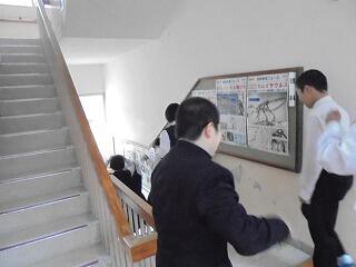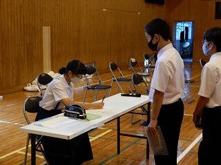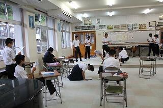 11月2日(月)の昼休みに、予告なしの防災訓練を実施しました。当日は雨が降っていたので、校舎外にいた生徒はいませんでしたが、教室や図書室、生徒会室、被服室など様々な場所で過ごしていました。全員すみやかに安全に避難できました。全体指導では、自分の命を守るために適切な判断が必要なこと、このような訓練を真剣に取り組むことの重要性を確認しました。避難する場所は、「落ちてこない、倒れてこない。」場所にすることも確認しました。事後指導として各学級で、今回の訓練の振り返りを行いました。みんな真剣に取り組んでいました。