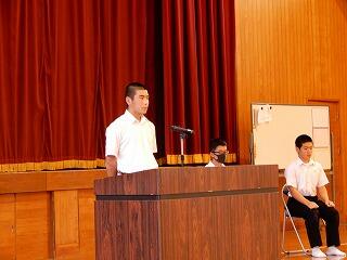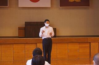 押方先生は、中学生時代のソフトテニス部のお話でした。きつかった練習、中体連最後の試合の記憶。熱く燃えた部活動の思い出。そこから学んだことは、支え合うこと。最後に「支えてくださった方々に感謝の気持ちをもって大会に臨んでほしい。」と話されました。