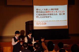 1月20日(水)のふれあいタイムで、「給食感謝集会」を開きました。司会・進行は、保体委員会の皆さんが行いました。全校保体委員長の藤本昊さんの給食への感謝の話があり、調理員の方々、栄養教諭の関口先生へ感謝状贈呈を行いました。調理員の菊池さんからは、「皆さんが残さず給食を食べてくれるので、こちらこそ感謝しています。」とありがたいお言葉をいただきました。保体委員会から、給食に関する話があり、給食の歴史等について、分かりやすくプレゼンしてくれました。最後に、関口先生から、健康な体つくりのためにいかに食が大切なのかという大切なお話をしてもらいました。ますます給食のありがたさを実感できました。調理員の常盤井さん、堀さん、興梠さん、菊池さん、関口先生、関係業者の皆様、食材を提供してくださる皆様、いつも美味しい給食をありがとうございます。