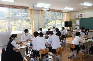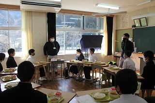 「ふれあい会食」では、生産者の方々と諸塚学校給食の日実行委員の方々に、生徒と一緒に給食を食べていただきました。生産者の方は、奈須隆生様(栗、椎茸など)、西川ふじえ様(割トウキビ)、黒木雄介様(米、茶、椎茸、ゆず、猟師)です。実行委員の方は、藤岡成美様(教育委員)、渡部恵太様(JA諸塚農課)、近藤和房様(役場企画課)です。いつも給食ではお世話になり感謝しています。今日の献立は、ジビエカレーでした。シカ肉はミンチされ、とても食べやすく調理していただきました。