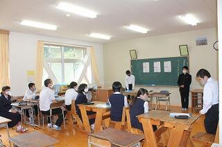 ふれあいタイムで、県中学校秋季体育大会選手推戴式が行われました。学校長の話の後、「生徒代表激励のことば」を前剣道部主将、若本陸玖さんが「地区代表として恥じぬよう力を出し切ってください。県大会を楽しんできてください。」と贈ってくれました。