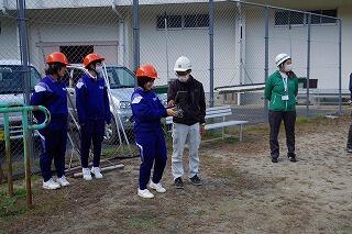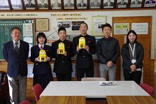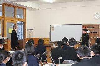 本日の6校時に、防災訓練(火災)を行いました。合言葉の「おかしも」もしっかり守りながら避難できました。避難後は、役場の消防主任である甲斐由高さんに講話をしていただきました。消火器の使い方を説明していただき、代表の生徒・職員が実際に消火器を使用して訓練しました。本日は風が強く実際には火をつけませんでした。風向きを考えて消火器を使用することの重要性を学びました。本日の訓練を通して、避難経路を確認し、冷静沈着に、敏速に避難することを再確認できました。