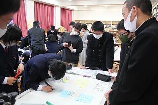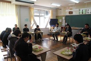 後半は、諸塚村住民福祉課の皆様と3年職員、養護教諭でグループワークを行いました。内容は、「自分の将来のために、今の自分にできることを考える。」でした。3グループに分かれ、それぞれの意見を出し合って練り上げていきました。今まさしく3年生にとって大切なテーマを話し合いました。
