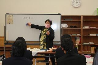 講義の中では、助産師を目指すきっかけになったお話や男性と女性の深い愛情によって赤ちゃんを授かるというお話から始まり、「命を大切にしてね。」「命の不思議さ、尊厳、に気づいてほしい。一生とおして学ぶ課題ですね。」「お母さんへの感謝、お父さんへの感謝を伝えてね。」「何か困ったら私の病院に電話してね。」とお話しをいただきました。生徒の皆さんの心に響きました。本日も夜中から3件お産に立ち会った後にお越しいただきました。本当にありがとうございました。