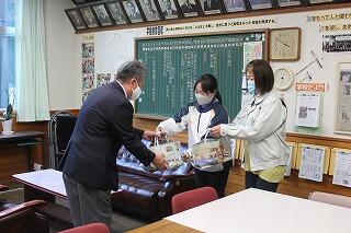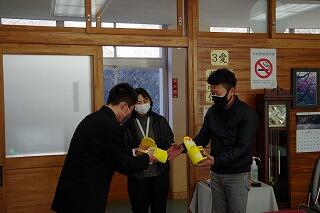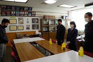 本日、婦人会からお手製のマスクを全生徒分いただきました。代表で婦人会の小松様、村教育委員会課長補佐の伊藤様にお越しいただきました。中には心温まるメッセージも入っています。大切に使わせていただきます。婦人会の皆様ありがとうございました。