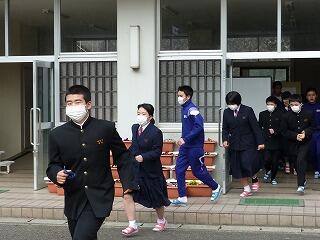 11月1日(金)の午前中に、地震を想定した避難訓練を実施しました。今回の訓練が今までと違うのは、訓練実施の事前連絡を生徒に対して一切与えていなかったことです。また、避難経路の一部が崩壊したという状況をつくり、自分たちでどう行動して安全な場所に避難すればよいのかを考えさせました。緊急地震速報を放送で流し、より緊迫した状態をつくって行った今回の避難訓練は、生徒たちにとって、いつもの訓練とは違う緊張感がもてたことは確かです。生徒たちは、教師の指示をしっかりと聞き、冷静に素早く避難することができました。訓練が終わったら体育館に移動して、防災に関するDVDを視聴して、災害発生時にどう対応して命を守ればよいのかを学びました。そして、給食では「救給カレー」がメニューに出ました。今回の避難訓練を計画した担当の先生の企画力に感謝します。