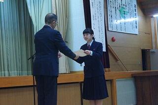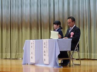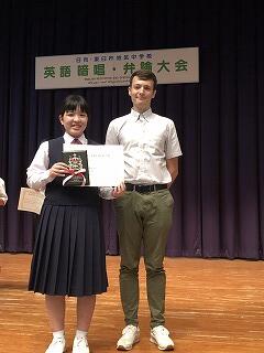 9月27日(金)に、日向・東臼杵地区英語暗唱・弁論大会が、日向市公民館を会場に開催されました。本校からは、暗唱の部に2年生の甲斐桜さんが出場しました。結果は、“最優秀賞”に輝き、県大会出場への切符を手にしました。県大会は、10月21日(月)に、宮崎市民文化ホール(イベントホール)で開催されます。桜さんの、県大会での活躍を心より願っております。