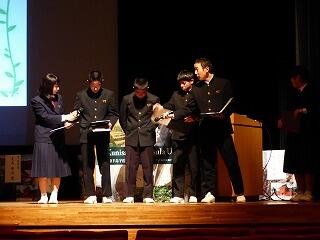 2月15日(土)、国東半島宇佐地域世界農業遺産中学生サミットが、大分県宇佐市で開催されました。本校の2年生代表(7名)の生徒が、このサミットに宮崎県を代表して参加してきました。大分県内の中学生による発表に加え、熊本県からの参加もあり、同じ世界農業遺産という強みをもつ中学校ならではの視点から、学習の成果が発表されました。他県の発表を聞くことで、また新たな気づきが生まれ、今後に向けて、どんな取組をしていけばよいのか、大変参考になりました。本校の発表も、寸劇を交えるなど、発表方法に工夫が見られました。また、発表の合間には、他県の中学生との交流も積極的に行うことができました。