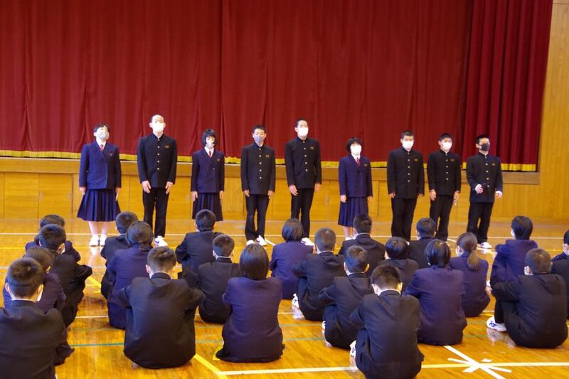 式の内容は、生徒会の説明や方針及び役員の自己紹介、各学年の紹介及び自己紹介、各部活動の紹介でした。また、部活動生としての心構えについてもお話がありました。応援される人になりましょうね。皆さん、限られた時間でコンパクトに、上手に紹介できました。1年生の皆さんも堂々と自己紹介できていました。これからの学校生活、部活動、楽しみですね。