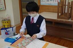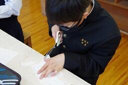 1年生は集中力が高く、ほとんどしゃべり声が聞こえない中で黙々とマスク作りに取り組んでいました。2年生は、「ガーゼ切りにくい!」「教えて~。」と心の声が思わず口に出ていました。2年生は家庭でマスクを作ったことがある人も何人かいて、友達にアドバイスをしていました。