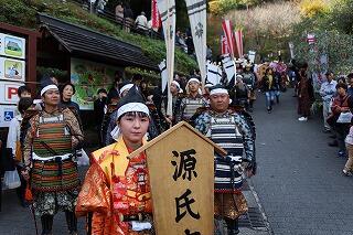 本校の生徒および職員が、11月10日(日)に開催された、椎葉平家まつりの「大和絵巻武者行列」に参加しました。この祭りは、椎葉村に伝わる、平家の姫「鶴富姫」と源氏の総大将「那須大八郎宗久」との悲恋を題材に、毎年この時期に開催される椎葉村最大のイベントになっています。武者行列では、平家方のきらびやかな衣装と、源氏方の勇ましい姿が見られました。行列に参加した生徒をはじめ職員は、大変貴重な経験ができ、よい思い出になったことと思います。