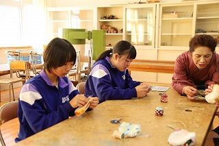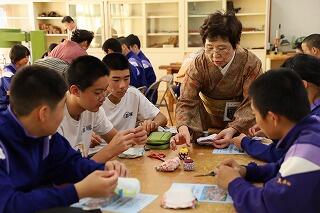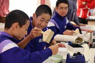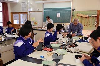 11月12日(火)に、ものづくり体験教室がありました。今年は、宮崎県職業能力開発協会から派遣していただいた方々から「和裁(がまぐち財布)」を、また、宮崎県技能士会連合会から派遣していただいた方々から「表装(化粧箱)」の指導を受けました。講師の皆様の熱心なご指導により、生徒たちは作品を見事に作り上げていきました。このような日本の巧みの技は、世界にも誇れるものであることを、改めて実感することができたようです。将来、ものづくりの道に進んでみたいなと思った人もいたのではないでしょうか。ご指導していただいた講師の皆様に感謝申し上げます。ありがとうございました。