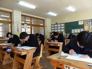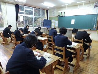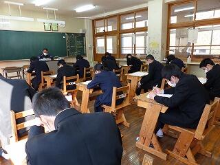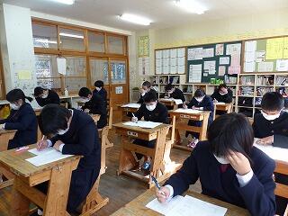 2月20日(木)、21日(金)の2日間は、学年末テストが行われました。本年度最後の定期テストということもあり、どの学年ともに真剣な表情でテストに臨んでいました。テストが終われば、一様に気分も楽になるところですが、3年生にとっては、県立高校の一般入試を控えています。まだまだ気を緩めることができません。また、1、2年生についても、進級を前に学年のまとめをしっかりとやっていきたいところです。