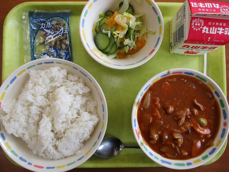 給食のカレーは人気メニューの一つです。大きな釜(鍋)でじっくり煮ることで、とてもおいしく仕上がります。今日は栄養価を高めるためにも、「豚レバー」を細かくしたものも加えています。気づきましたか?