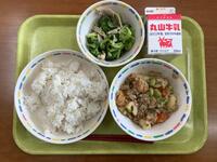 今日は豚肉と野菜をたくさん使った肉野菜炒めを出しました。玉ねぎ・キャベツ・ピーマンと豚肉を炒め、ウスターソースやオイスターソースなどで味付けしたごはんがすすむ一品です。