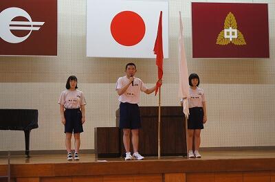 7月23日(火)は、1学期終業の日でした。清掃の後、体育大会の結団式が行われました。団の色が決定した後、団旗が授与され、体育大会に向けて本格的に始動しました。その後は、両団ともに応援パフォーマンスを行い、本番に向けての士気を高めました。結団式終了後は、終業式が行われ、各学年及び生徒会代表の生徒が1学期の反省を発表しました。どの生徒も、しっかりとこれまでの自分自身を振り返り、今後に向けて取り組むことを堂々と述べてくれました。夏休みは、8月27日(火)までで、その間、8月1日(木)と、8月19日(月)が登校日となっています。有意義な夏休みを過ごしてほしいと思います。