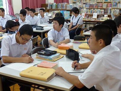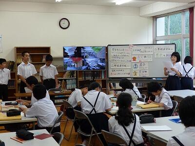 7月9日(火)に、小規模校の特性を生かした授業を1,2年生が行いました。修学旅行で京都に行った2年生が、京都の魅力などを、1年生にプレゼンテーションするという言語活動です。聞く側の1年生も、来年自分たちが実際に行く場所なので、興味津々です。そして、1年生は発表者である2年生に対して質問をしなければなりません。2年生は、1年生のために魅力ある伝え方が求められます。目的意識、相手意識が明確であると、授業への取組も自ずと主体的になります。小規模であるがために、このような学習活動にも取り組むことが可能です。