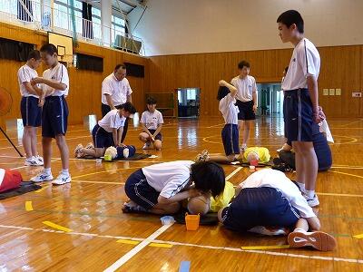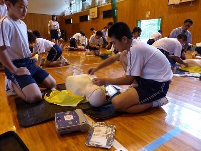 7月19日(金)に、日赤宮崎県支部の方を講師に迎え、赤十字救急法講習会が行われました。初めに、講師の方から胸骨圧迫のみの心肺蘇生やAEDの使い方についての説明がありました。その後は、グループに分かれ、実際に胸骨圧迫を行ったり、AEDを装着したりする体験を行いました。今回の講習で学んだ知識や、心肺蘇生に関する技術は、しっかりと頭の中にいれておいてほしいと思います。