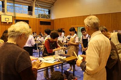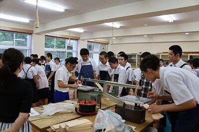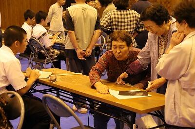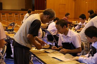 14日(金)に、これから学園生との交流会が行われました。これから学園は、本村の寿会(敬老会)に所属している方々を中心に構成されています。活動内容として、児童生徒との世代を超えた交流などがあり、今回は、本校の生徒と一緒になって杓文字を制作しました。一枚の板から杓文字の型をとり、のこぎりで切り取ります。それを、カンナや紙やすりなどを使ってきれいに仕上げていき、最後に、くぬぎ地蔵の刻印を押して完成です。生徒は、制作の過程で、これから学園生の方々との会話を通して、交流の和を深めることができたようです。世界に一つしかない杓文字、いつまでも大切に使ってほしいと思います。学園生の皆様、大変お世話になりました。ありがとうございました。
