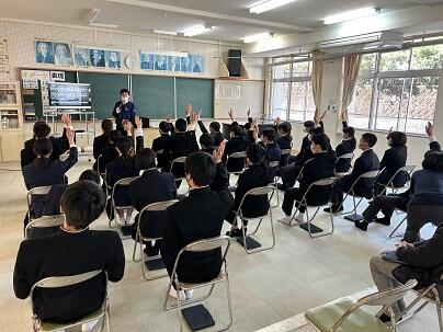 3月7日(木)、諸塚村役場と連携して、3年生に向けて、「思春期服体験学習」を実施しました。卒業を間近に控え、家を巣立つ生徒の自立に必要な、「性」の講話に始まり、将来の生活設計にも取り組んでみました。いよいよ「十五の春」が近づいたことを実感しています。