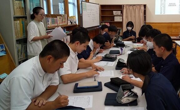 2校時に全校生徒が図書室に集まり、夏休みの課題の読書感想文の書き方について国語科の先生より指導を受けました。夏休みに読書に親しみ、気持ちのこもった感想文が書けるといいです。