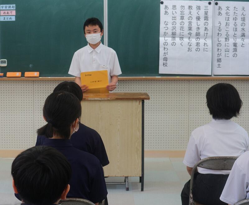 ふれあいの時間に7月13日(土)14日(土)実施される、県中学校総合体育大会の推戴式が行われました。今回の大会には、卓球競技男子個人、野球競技、剣道競技男女団体、男女個人に8名の選手が出場します。あと一週間練習して、ベストコンディションで臨んでくれると思います。保護者の皆さまの温かいご支援が大きな力です。