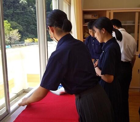 昼休みは、体育大会で使用した旗のアイロン掛けを実行委員が被服室で行いました。