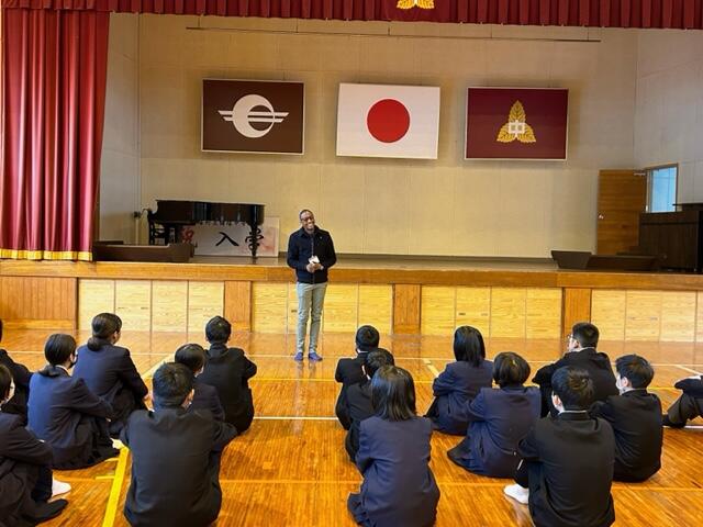 令和5年5月31日(水)、宮崎大学国際連携センター特別講師で日本語教育専門の鵜澤威夫先生が諸塚中学校に来校され、「国際理解教育~教室から世界へ~」を実施されました。