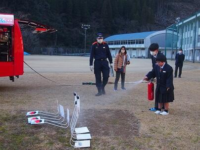 1月28日〔月)、防災訓練を実施しました。今回は火災想定での訓練でした。校内放送での火災発生と避難指示を受け、生徒はグラウンドに避難しました。その後、村役場の担当の方からの講話と、消火作業、消防車見学という内容でした。