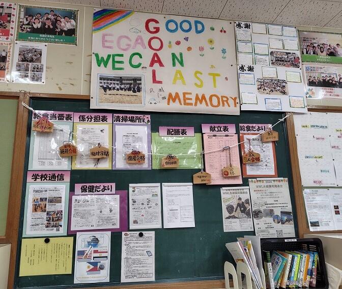 今日は曇り空で少し寒かったですが、生徒たちは授業に集中していました。教室後方の掲示板も興味関心をかき立てる内容です。