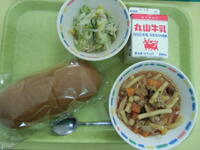 ひき肉と豆のカレーには、ひよこ豆を使いました。ひよこ豆を含む豆類には、体の筋肉や血を作ったり、体を丈夫にするたんぱく質や、お腹の中をきれいにする働きの食物繊維を多く含んでいます。給食でも豆類をよく使っています。