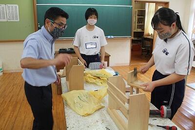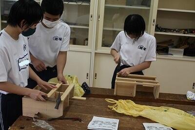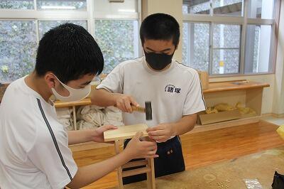技術室から、いつもより忙しく金槌の音が響いてくるので見学に行ったら、本棚製作の最終時間でした。サポートする姿も見られました。最後には全員完成しました。いい作品ができましたね。