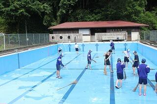 水泳の授業にむけて、プール清掃をがんばっています。暑い中ですが、プールで泳ぐ気持ちよさを思い浮かべながら、きれいに掃除しています。カエルもいっぱい泳いでいましたが、川に帰ってもらいました。写真は2年生です。