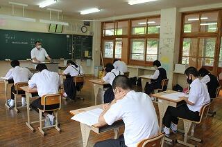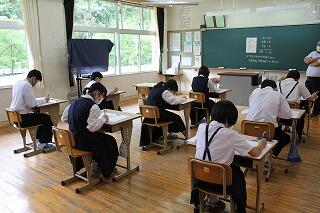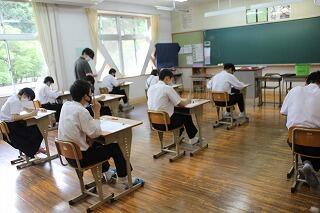 本日から、1学期の期末テストが始まりました。1年生にとっては初めての校内定期テスト。手ごたえはどうだったでしょうか。テストは明日まで。最後まであきらめずに取り組んでほしいです。画像は、本日2校時のテストを受けている様子です。