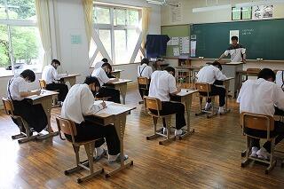 本日から、1学期の期末テストが始まりました。1年生にとっては初めての校内定期テスト。手ごたえはどうだったでしょうか。テストは明日まで。最後まであきらめずに取り組んでほしいです。画像は、本日2校時のテストを受けている様子です。