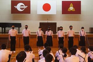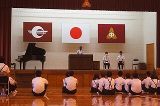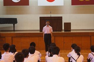 終業式では、1学期の反省を3人の代表にしてもらいました。1年生真慈さんは、「家庭学習の工夫や部活で活躍できるよう鍛錬する。集団の一員としての行動を自覚する。」と発表しました。2年生の空良さんは、「学習の取組努力できた。学級で協力できた。先輩としてのリーダーシップを発揮していきたい。」と発表しました。3年生の芹華さんは、「意見をまとめられるよう日々の話し合いを大事にしたい。意見を積極的に発表していく。夏休みを有意義に過ごす。」と発表しました。