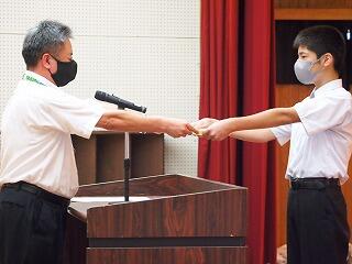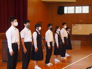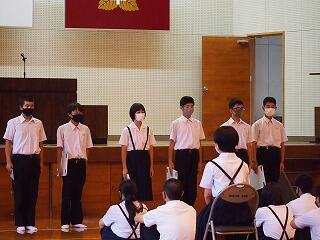 表彰は、卓球部の女子団体優勝賞状・優勝旗校納を代表で尾形さん、遙音さん、個人戦2位こはるさん、3位保那さん、剣道部は女子個人戦優勝亜依さん、そして、東臼杵地区サイエンスコンクール最優秀賞空良さん、優秀賞里香さんを表彰しました。おめでとうございました。