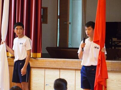 7月21日(金)は、終業の日でした。午前中は大清掃、体育大会結団式、終業式というプログラムでした。結団式では、3年生の小川君、山塚君、二人の団長を中心とした、リーダー紹介と団色決定を行いました 。体育大会もいよいよ始動です。