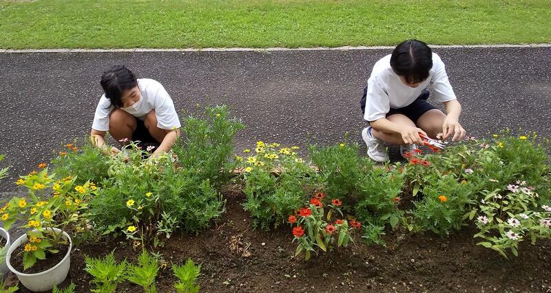 部活動生徒(剣道部・卓球部)も暑い中ですが、練習に励んでいます。また、花壇の手入れもしています。