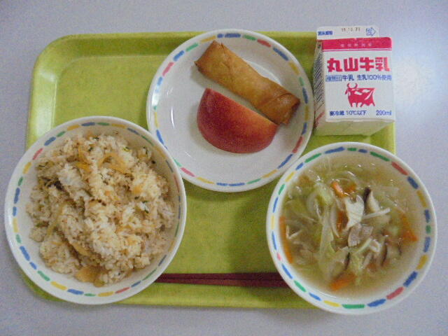 今日は、小学校の給食がないため、調理作業の時間にゆとりがあったので、カットしたりんごがつきました。給食では、調理作業上、なかなか果物をつけることができないので、ご家庭でぜひ、食べてもらえたらと思います。