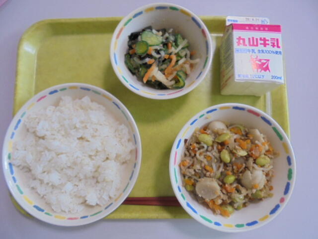 ひき肉と豆のカレーには、ひよこ豆を使いました。ひよこ豆を含む豆類には、体の筋肉や血を作ったり、体を丈夫にするたんぱく質や、お腹の中をきれいにする働きの食物繊維を多く含んでいます。給食でも豆類をよく使っています。