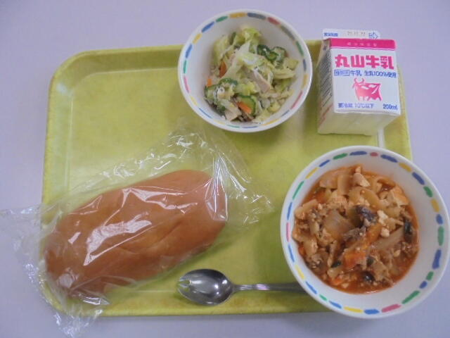 豆腐のチリソース煮は、不足しがちな豆製品をたっぷり食べられる献立でした。