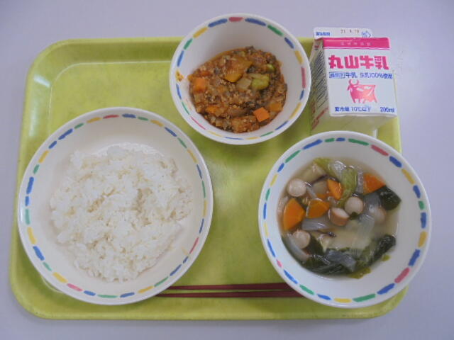 ひき肉と豆のカレーには、ひよこ豆を使いました。ひよこ豆を含む豆類には、体の筋肉や血を作ったり、体を丈夫にするたんぱく質や、お腹の中をきれいにする働きの食物繊維を多く含んでいます。給食でも豆類をよく使っています。