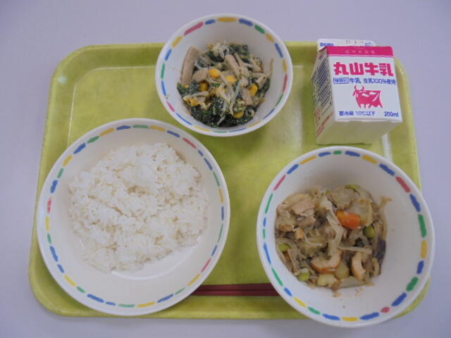 ひき肉と豆のカレーには、ひよこ豆を使いました。ひよこ豆を含む豆類には、体の筋肉や血を作ったり、体を丈夫にするたんぱく質や、お腹の中をきれいにする働きの食物繊維を多く含んでいます。給食でも豆類をよく使っています。