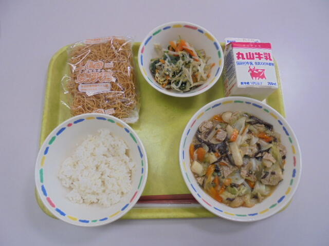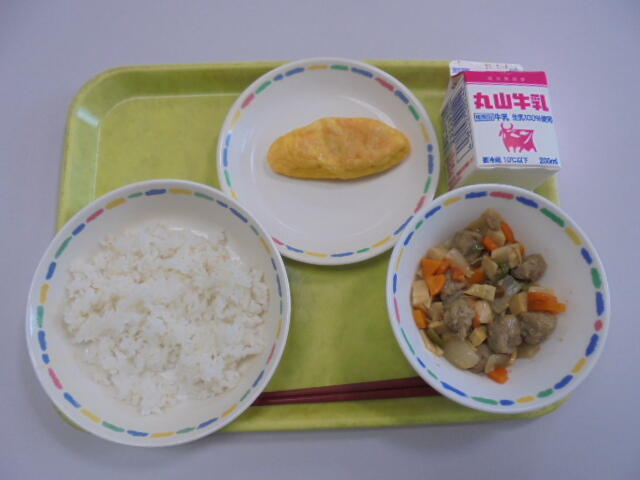 今日は、不足しがちな大豆製品をたっぷり食べられる「豆腐の五目あんかけ」でした。また、ほうれん草ソテーは、ウインナーも入れておいしく食べられるようにしました。