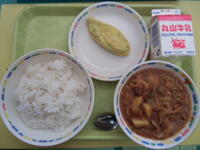 ひき肉と豆のカレーには、ひよこ豆を使いました。ひよこ豆を含む豆類には、体の筋肉や血を作ったり、体を丈夫にするたんぱく質や、お腹の中をきれいにする働きの食物繊維を多く含んでいます。給食でも豆類をよく使っています。
