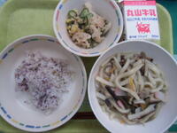 今日はかみごたえのあるれんこんを使ったかみかみ和えと、春においしい山菜たっぷりなうどんでした。